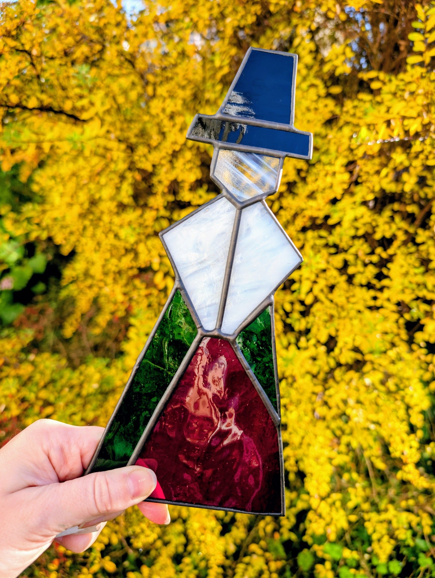 This piece is handmade using the copper foil stained glass technique. It contains solder made from lead and tin, and lead came may be present. For safety, please wash hands after handling. This is decorative glass art intended for indoor display and is not a toy - keep out of reach of children and pets.
