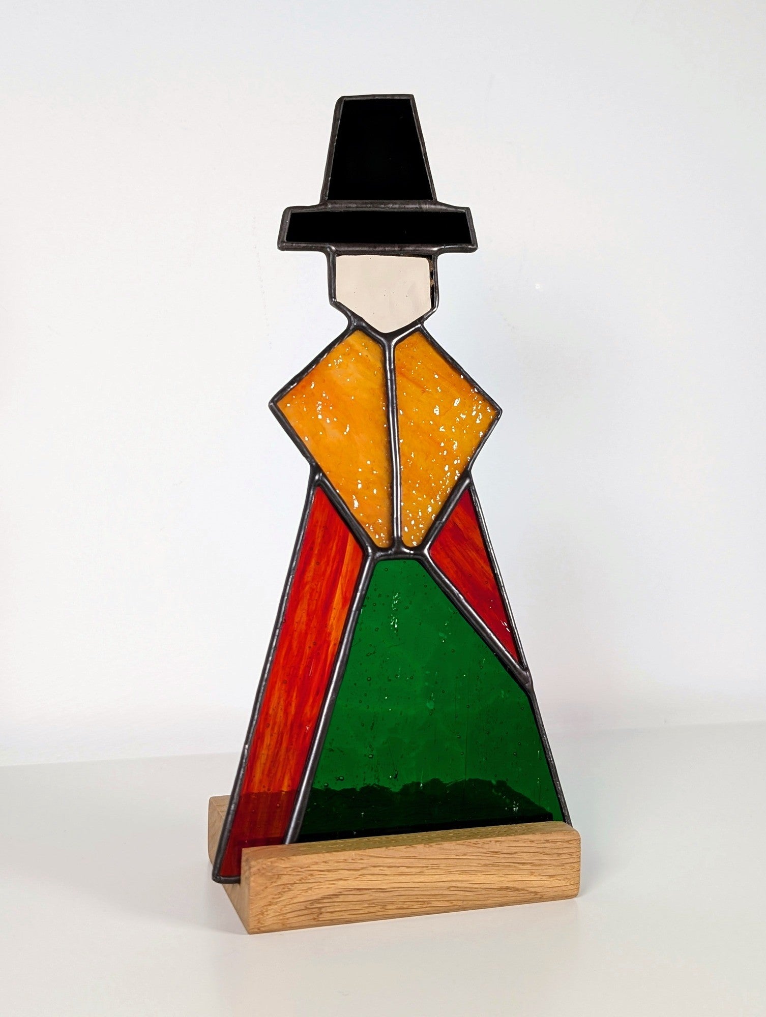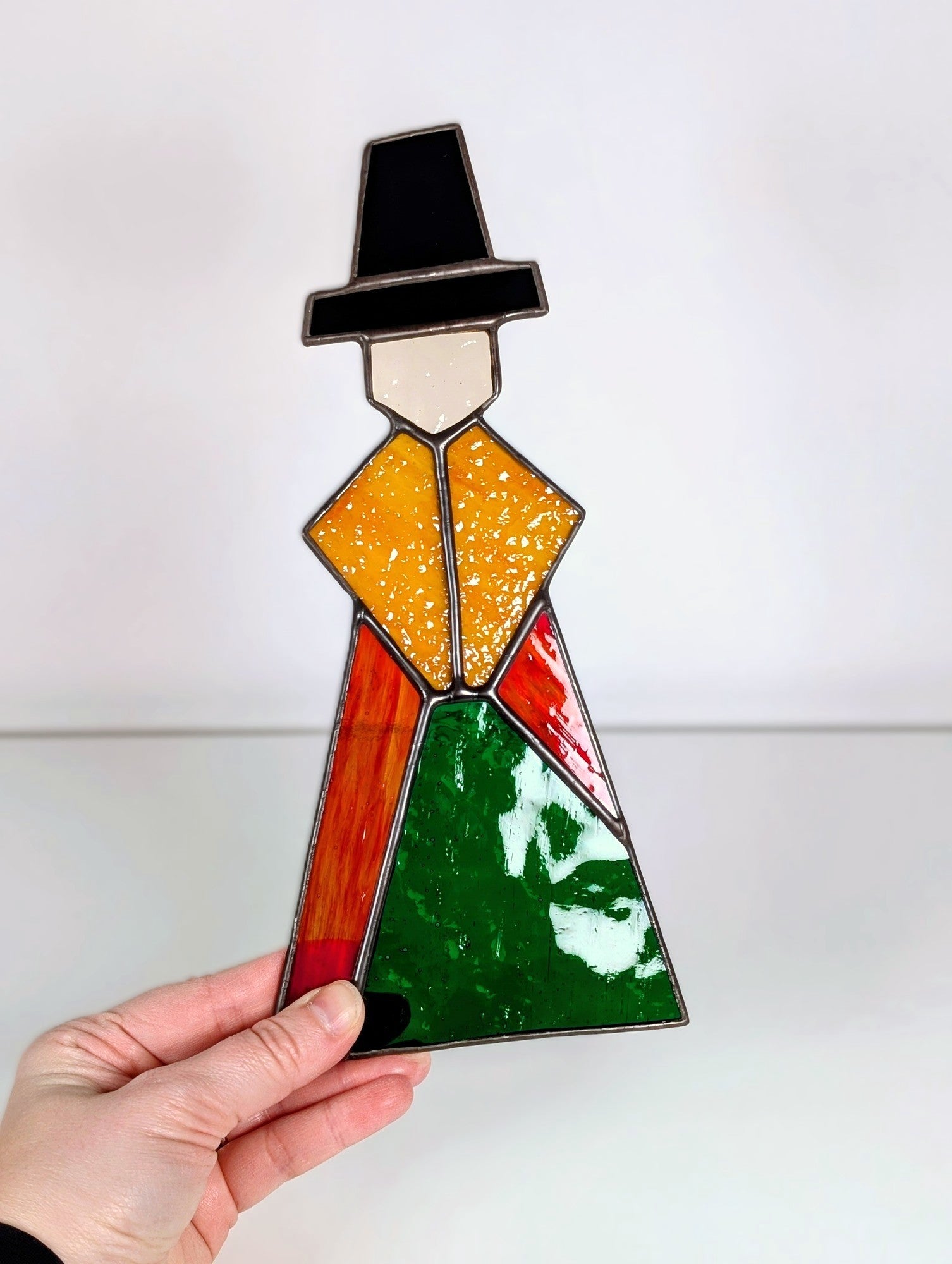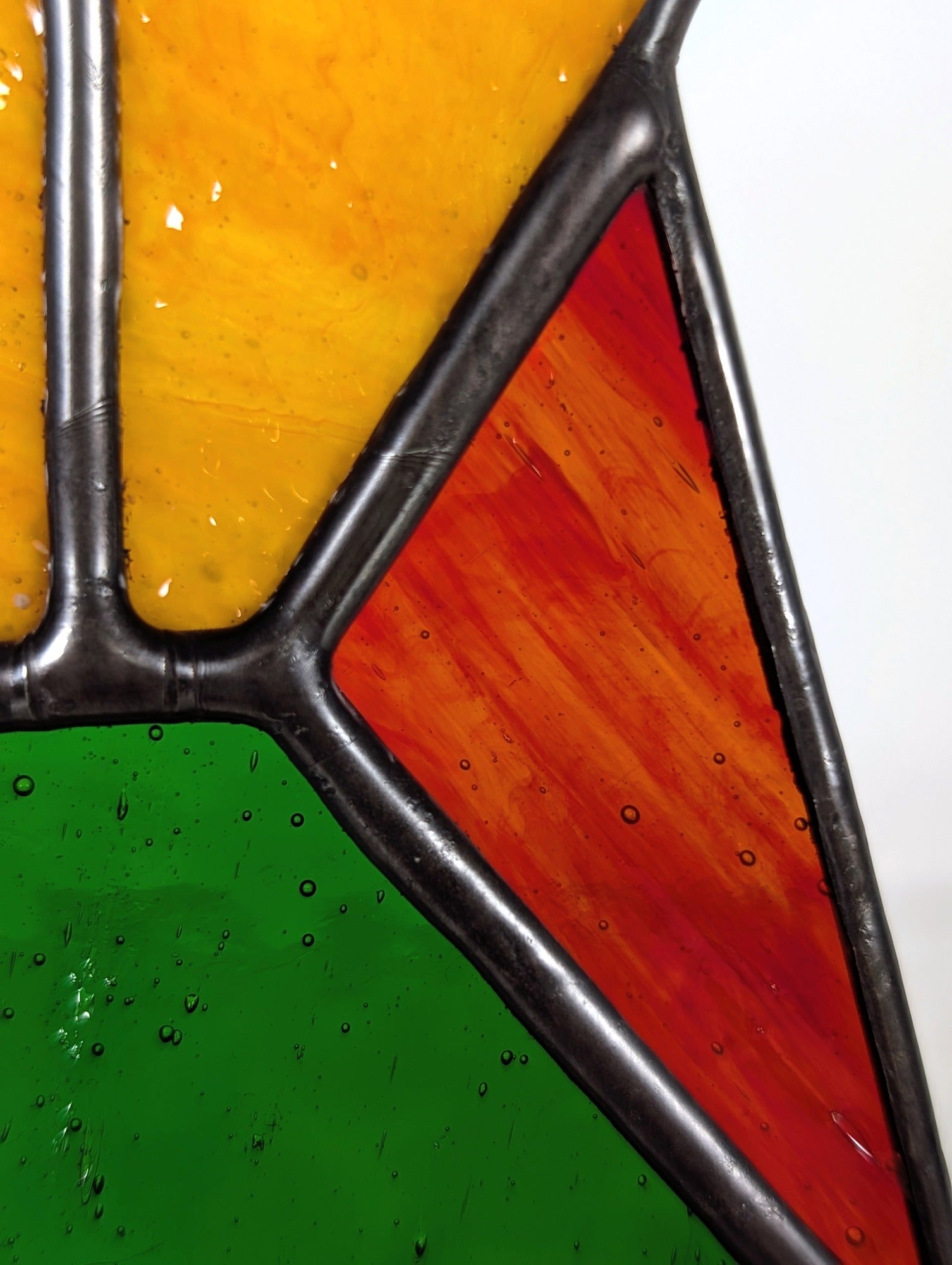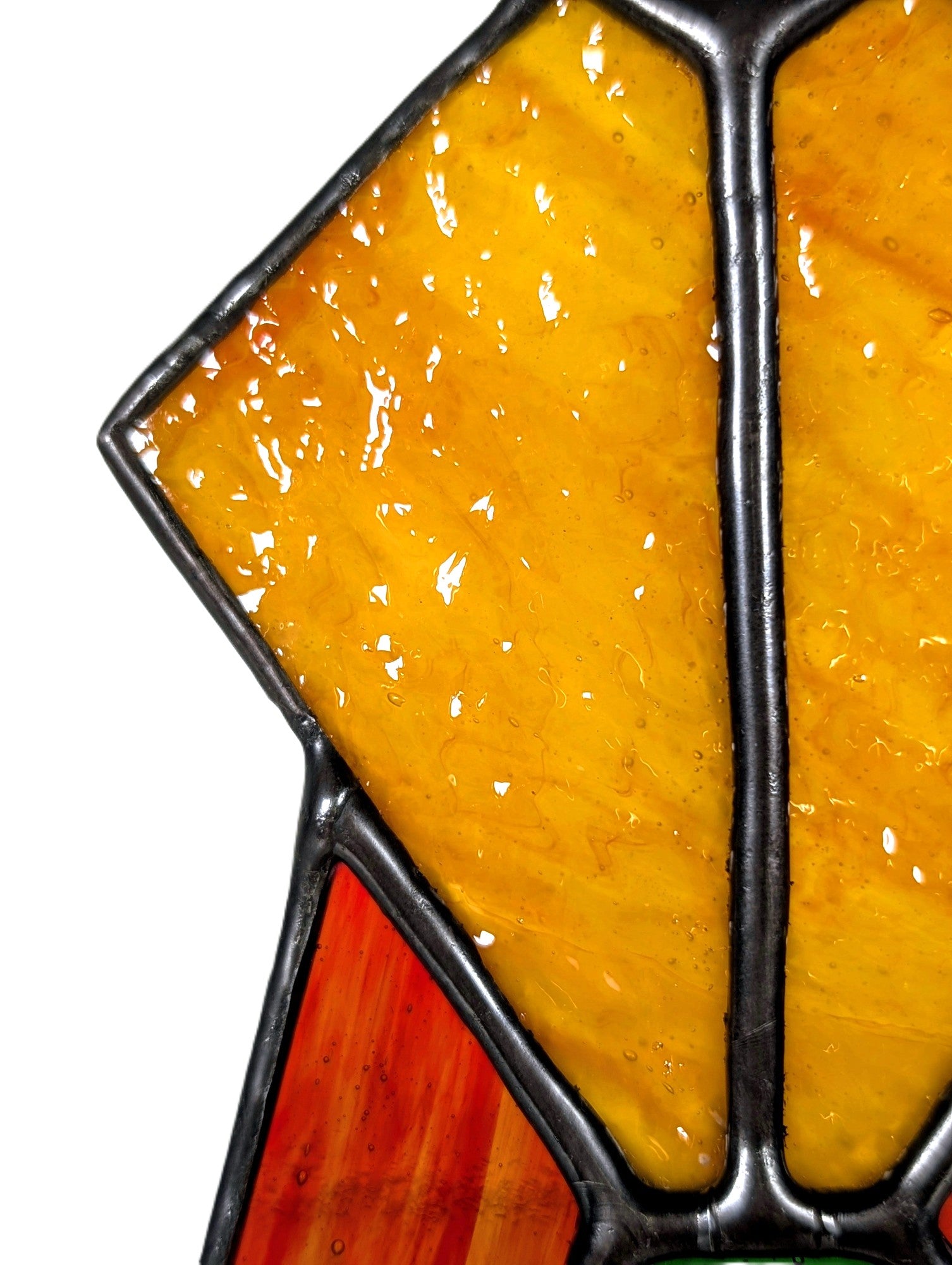 This piece is handmade using the copper foil stained glass technique. It contains solder made from lead and tin, and lead came may be present. For safety, please wash hands after handling. This is decorative glass art intended for indoor display and is not a toy - keep out of reach of children and pets.