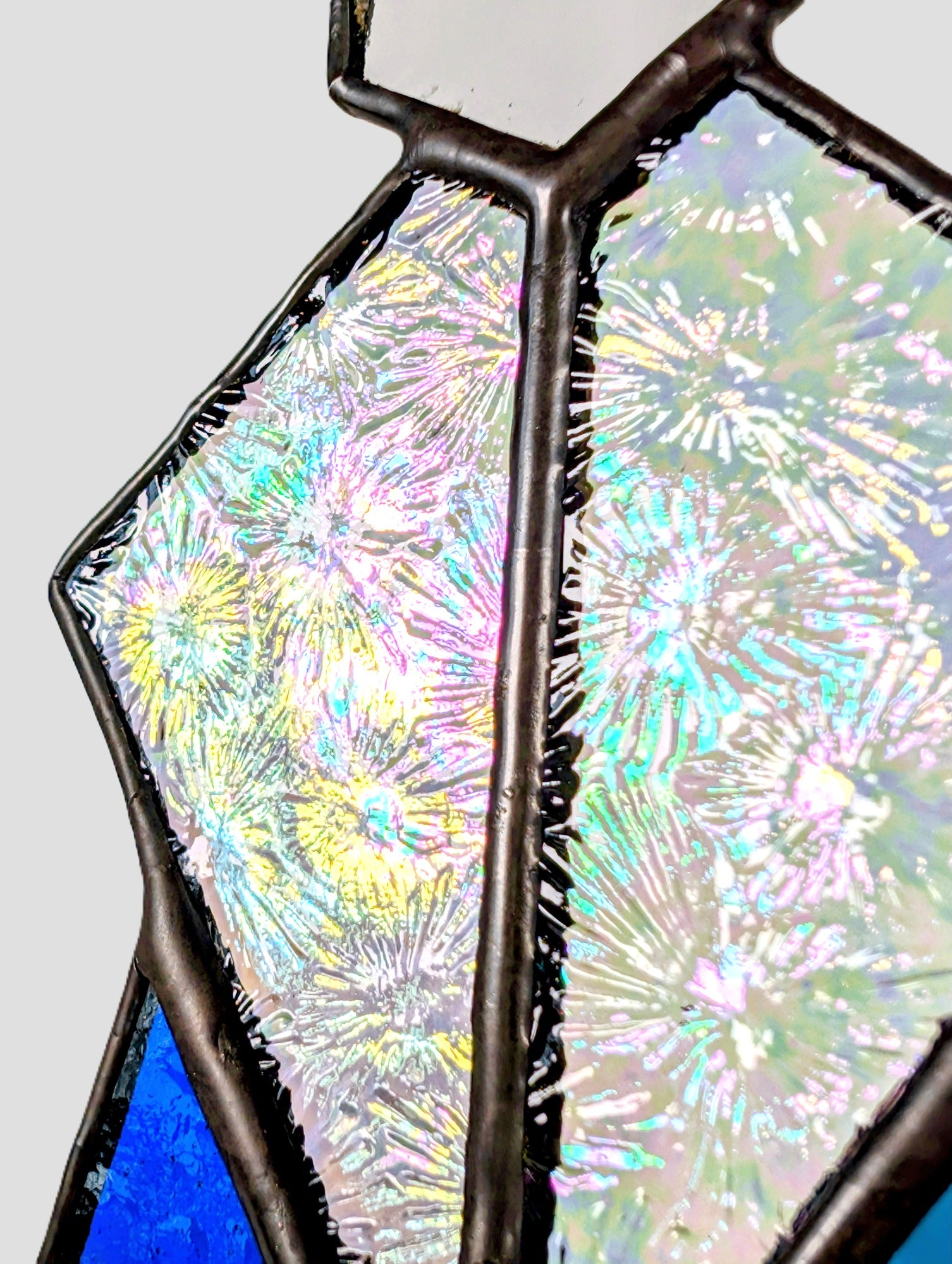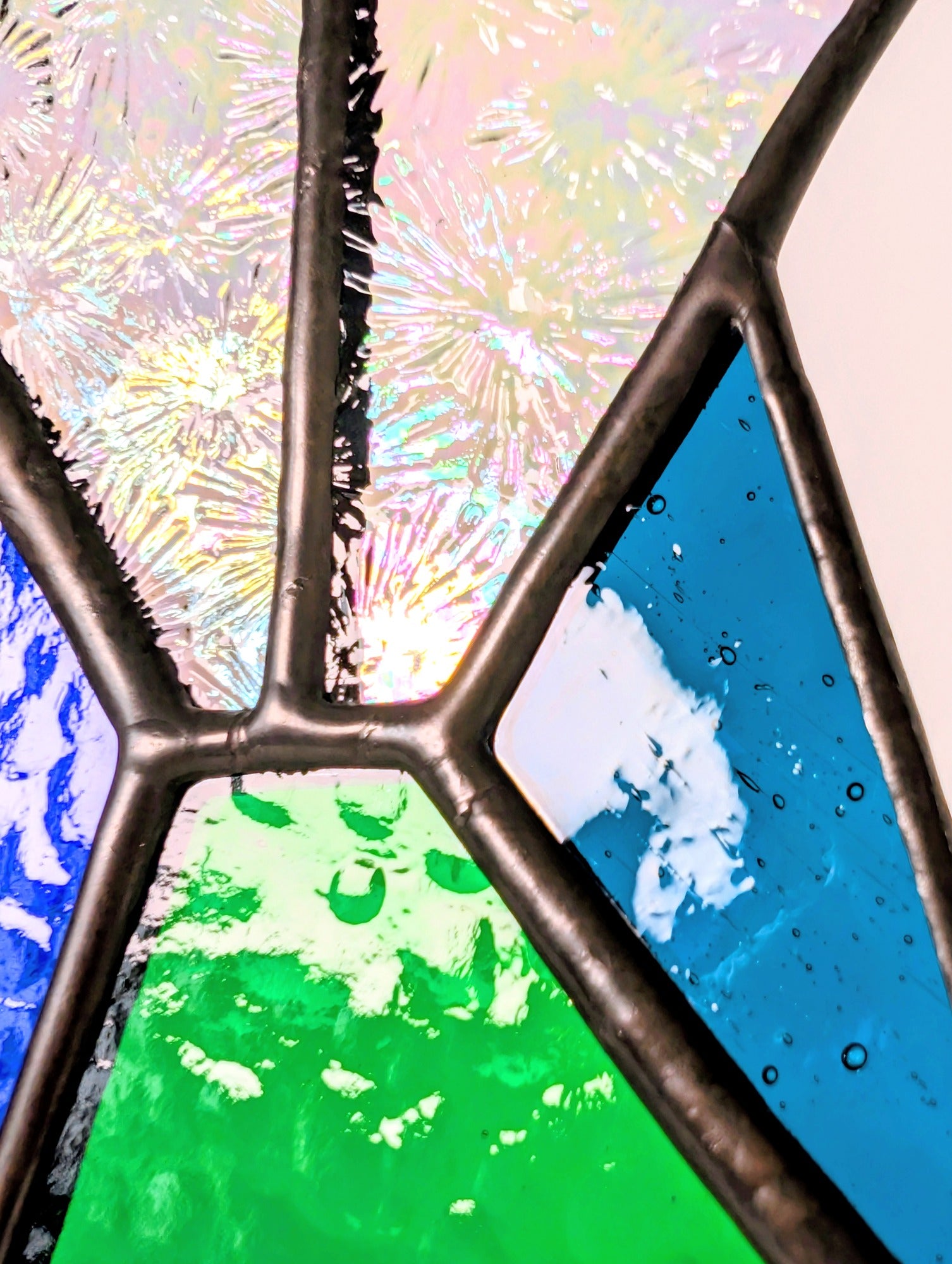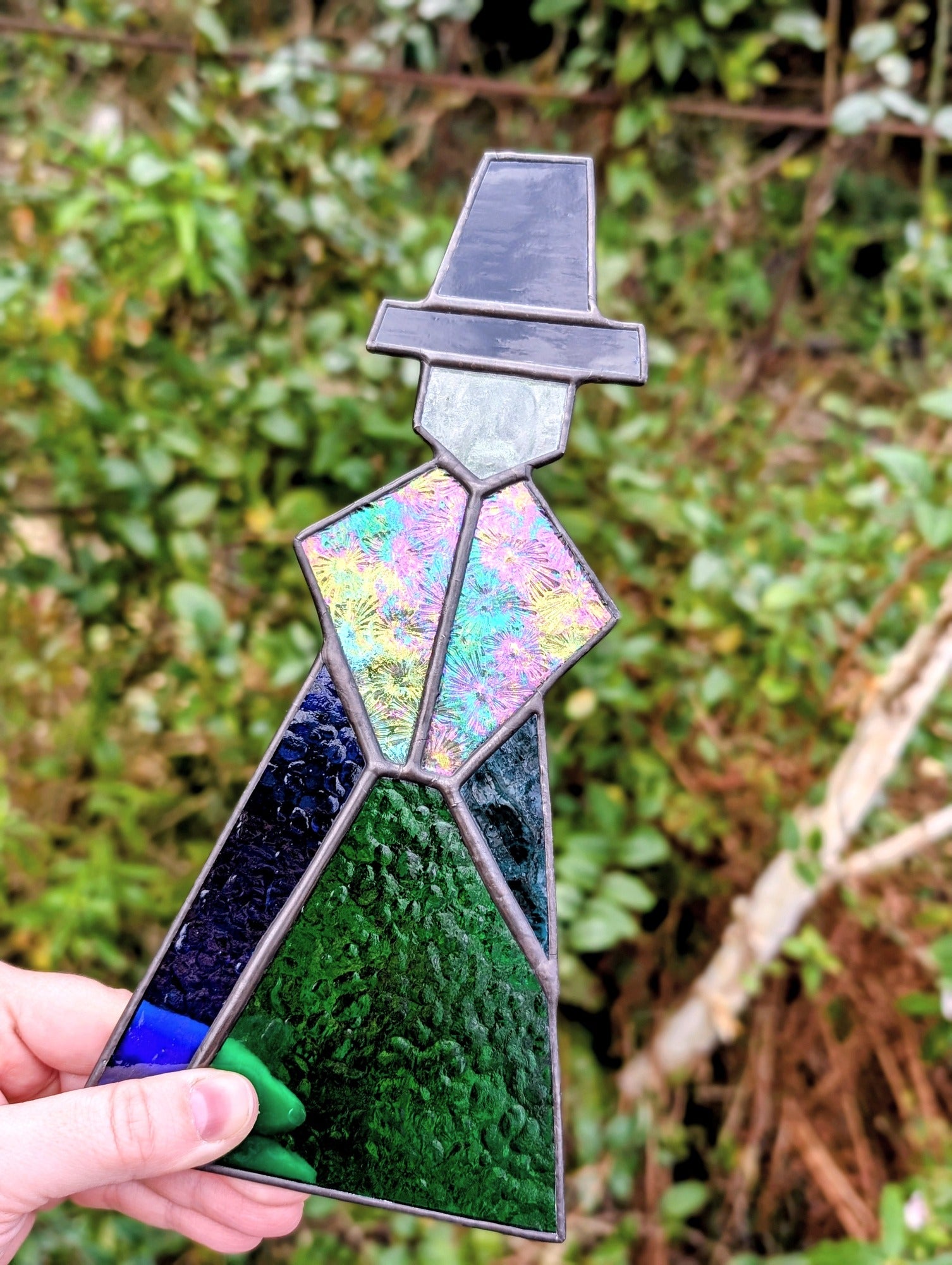 This piece is handmade using the copper foil stained glass technique. It contains solder made from lead and tin, and lead came may be present. For safety, please wash hands after handling. This is decorative glass art intended for indoor display and is not a toy - keep out of reach of children and pets.