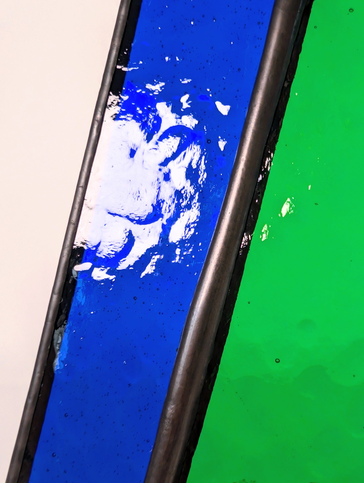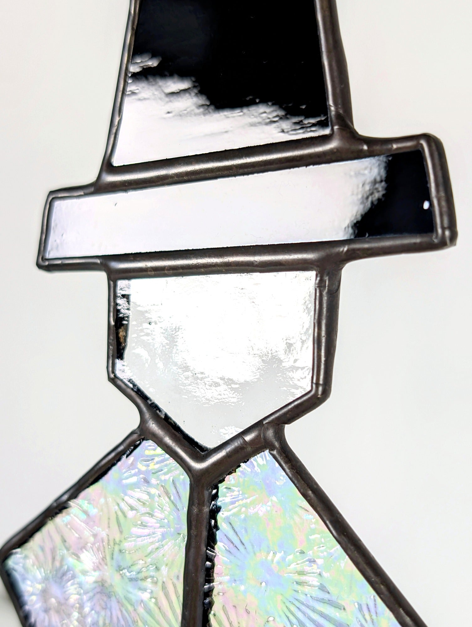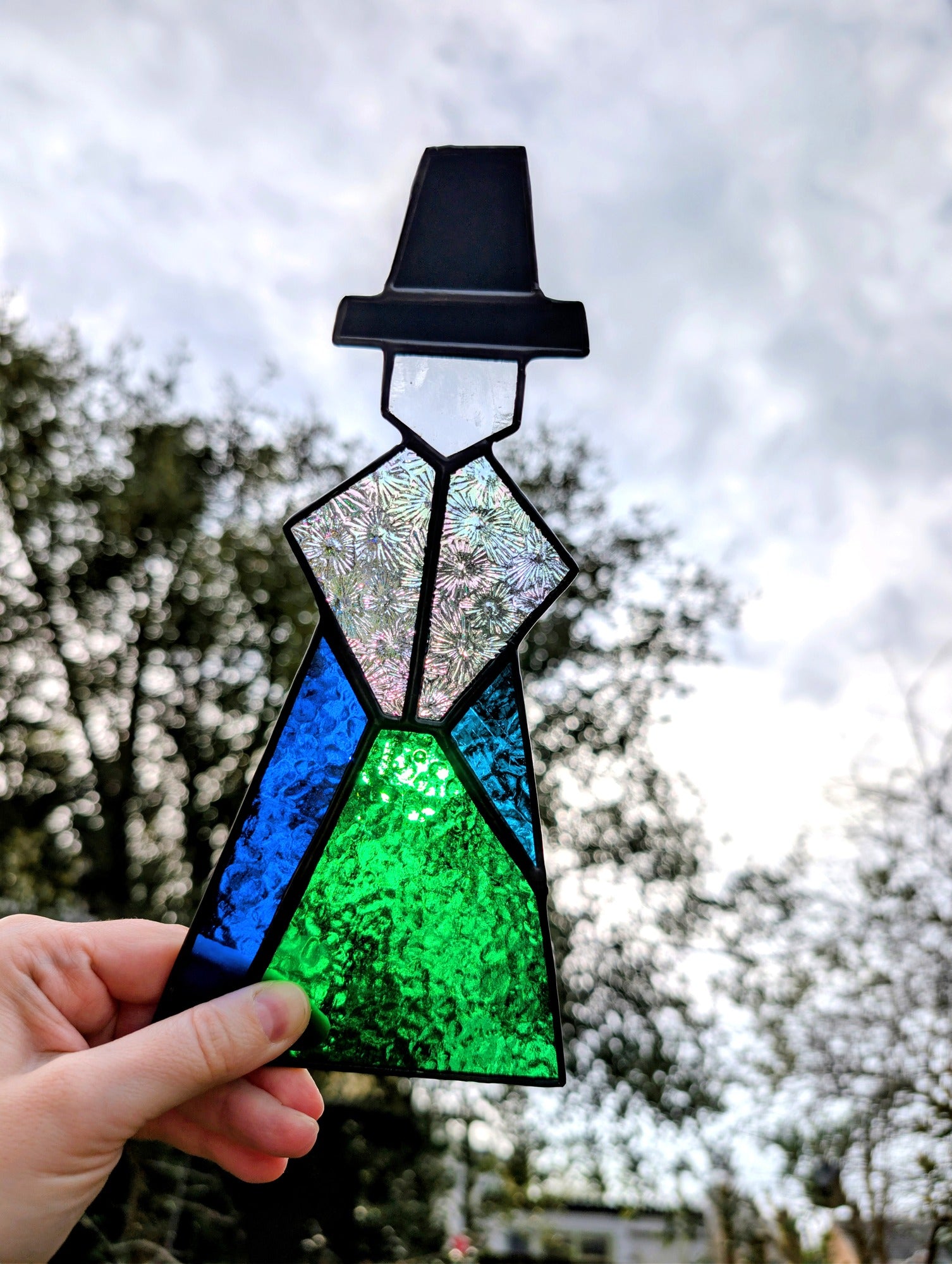 This piece is handmade using the copper foil stained glass technique. It contains solder made from lead and tin, and lead came may be present. For safety, please wash hands after handling. This is decorative glass art intended for indoor display and is not a toy - keep out of reach of children and pets.