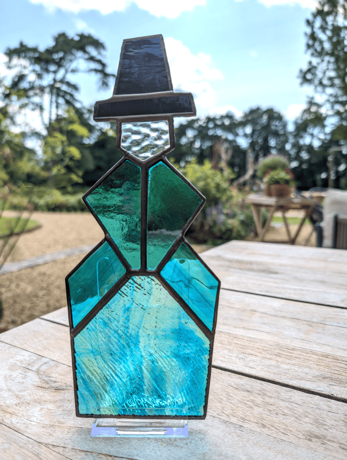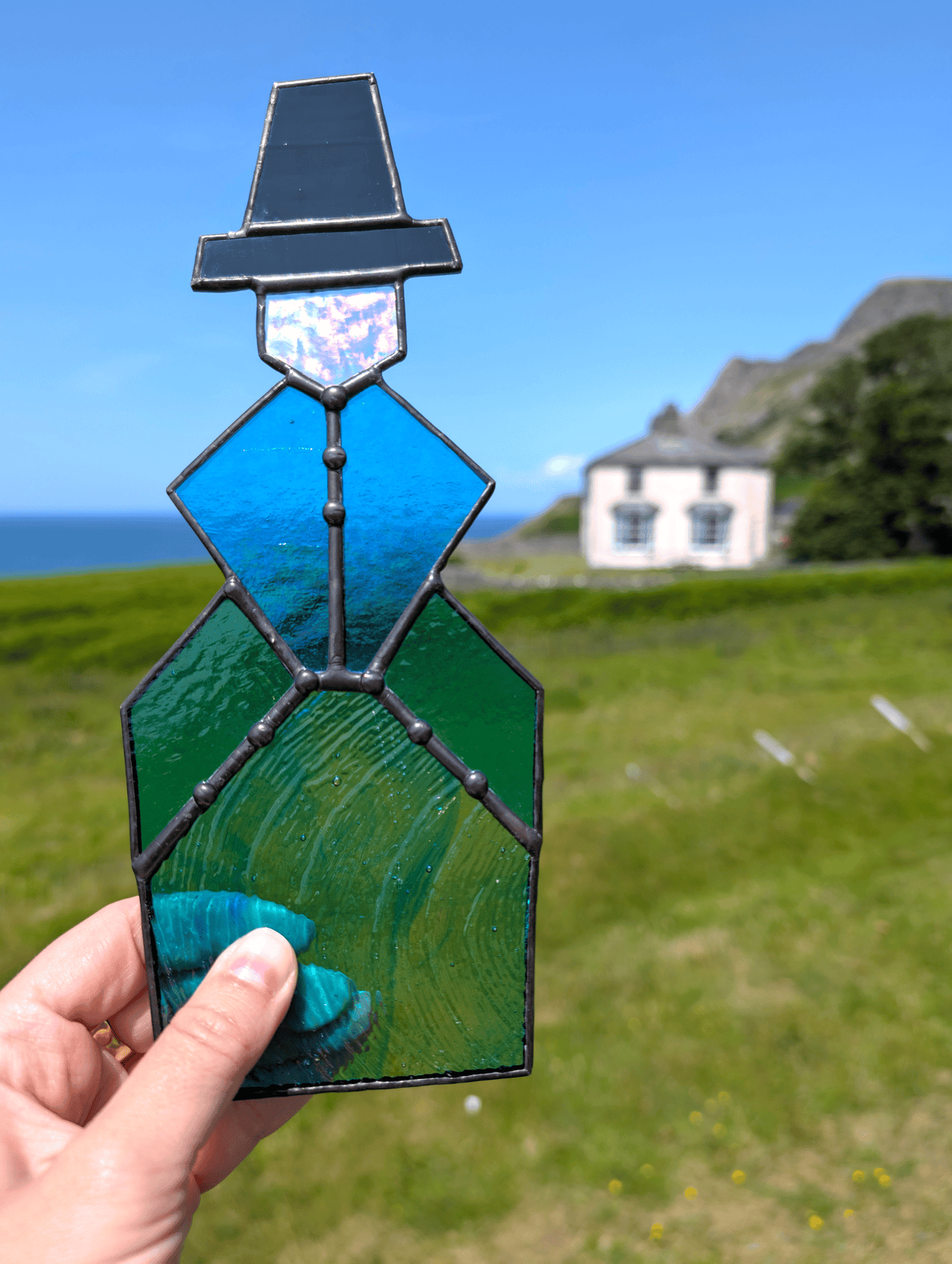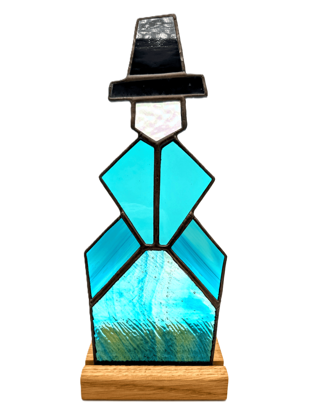 Delyth is the wisdom bearer of Merched Cymreig - a dignified figure embodying memory, resilience, and the strength passed down through generations. Her silhouette in the iconic Welsh hat and skirt honours the presence of grandmothers and foremothers, brought to life in shifting glass and enduring craft.