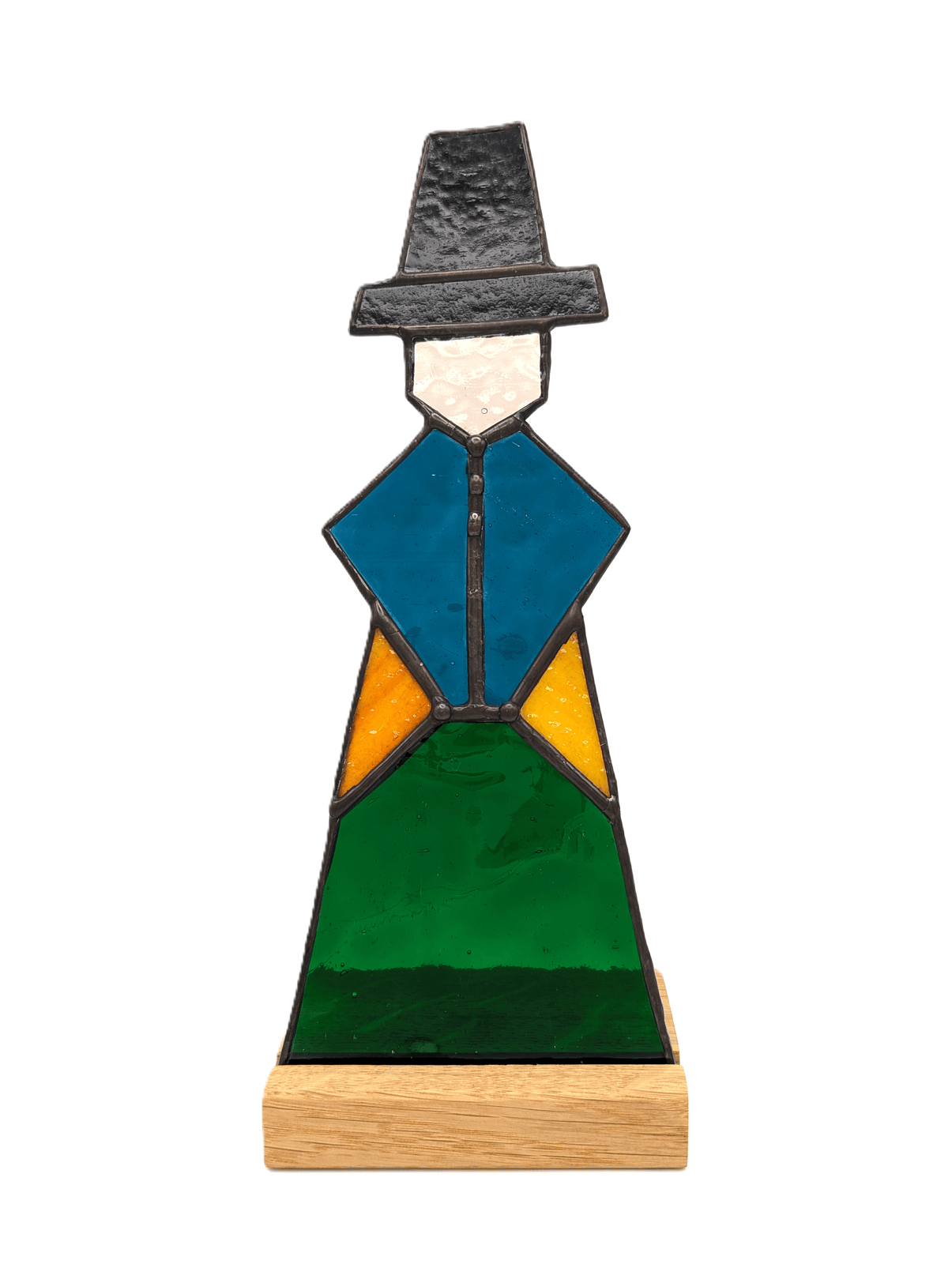 Mared embodies curiosity and continuity within Merched Cymreig. Her modern, geometric silhouette - tipping its hat to Welsh tradition - catches shifting light like new beginnings, crafted in coloured glass to honour the next link in the lineage.