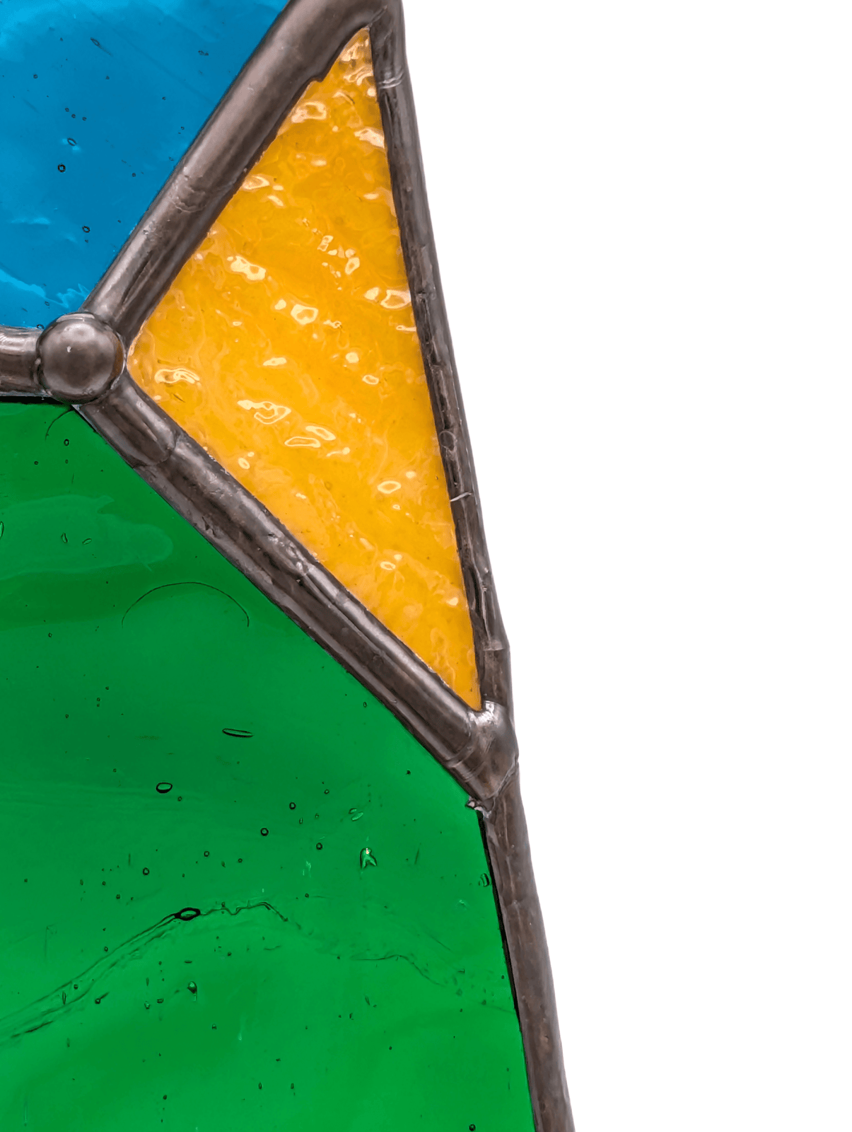 This piece is handmade using the copper foil stained glass technique. It contains solder made from lead and tin, and lead came may be present. For safety, please wash hands after handling. This is decorative glass art intended for indoor display and is not a toy - keep out of reach of children and pets.