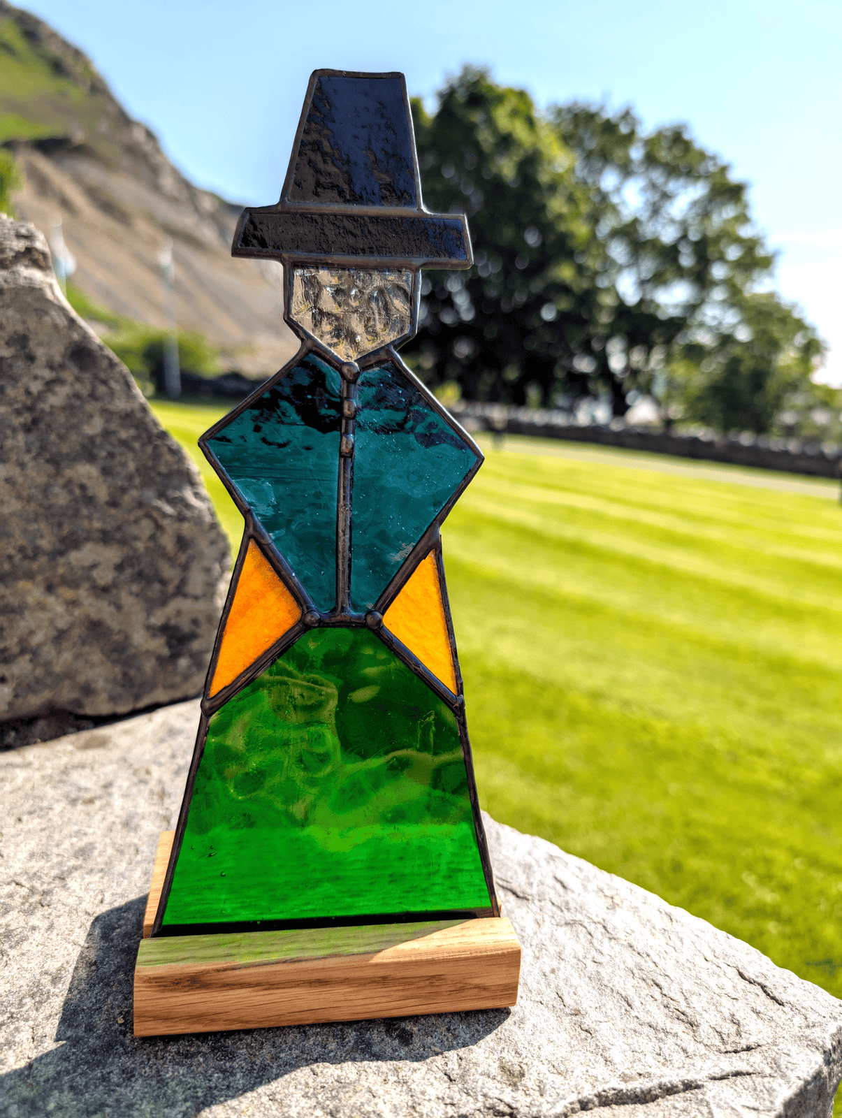 Each piece is made to order, and you’re welcome to choose the colours of the poncho and skirt in the order notes. I will then carefully select the glass textures and tones that bring those choices to life, ensuring your piece is harmonious, unique, and truly one of a kind. If you do not provide any colour preferences, I will use the colour scheme from the pictures shown. The iconic Welsh hat will be made from opaque black glass - as shown in pictures, to maintain the integrity of cultural reference and design.