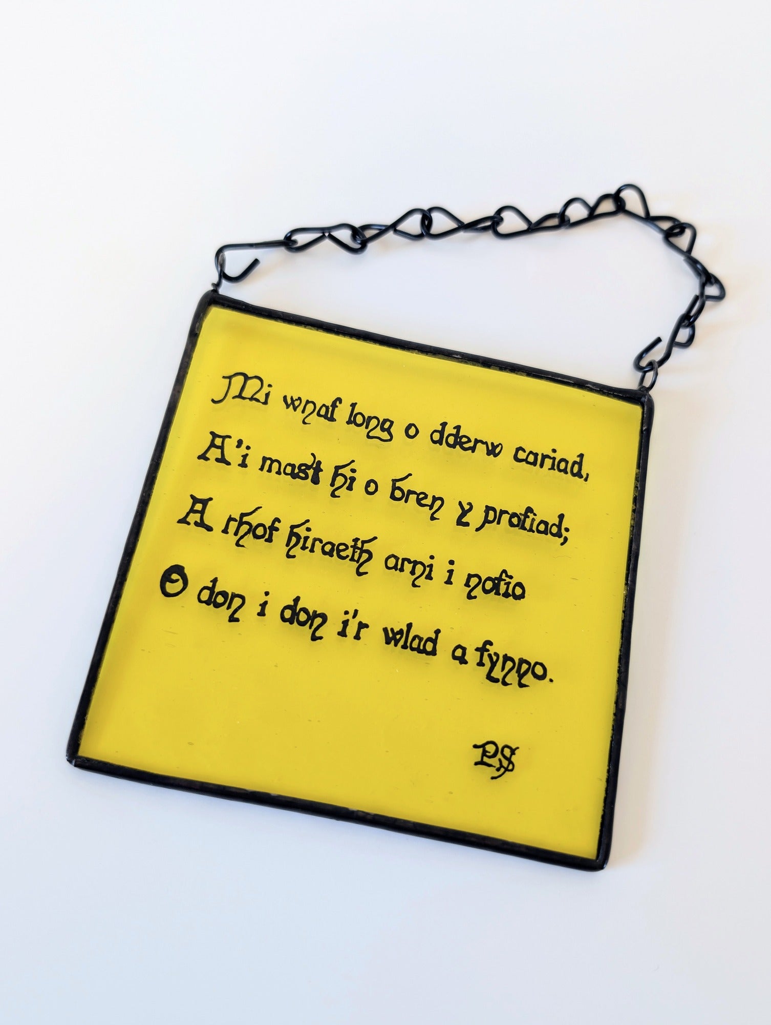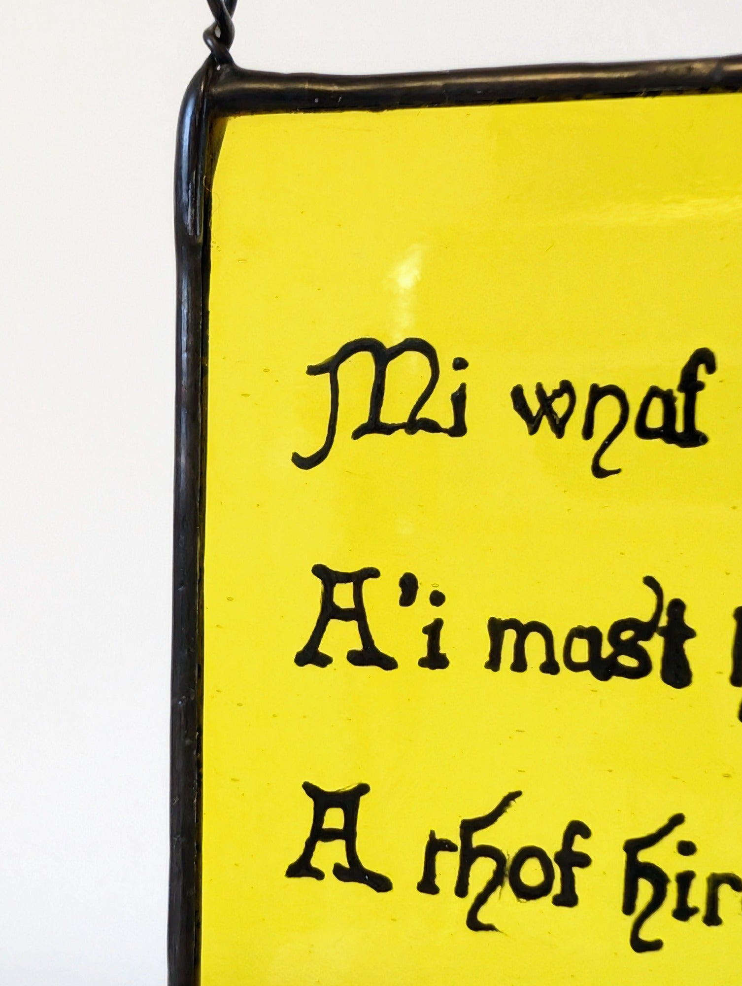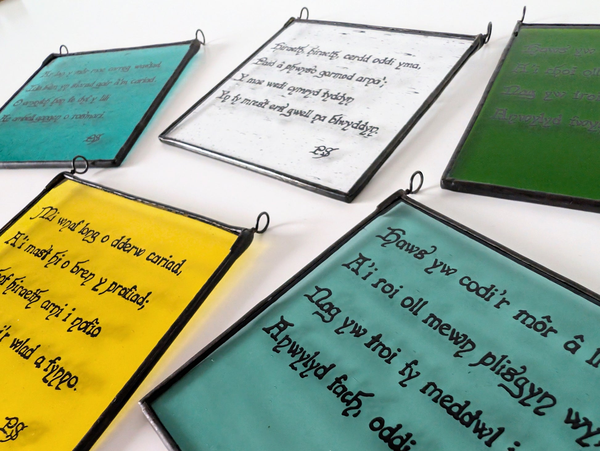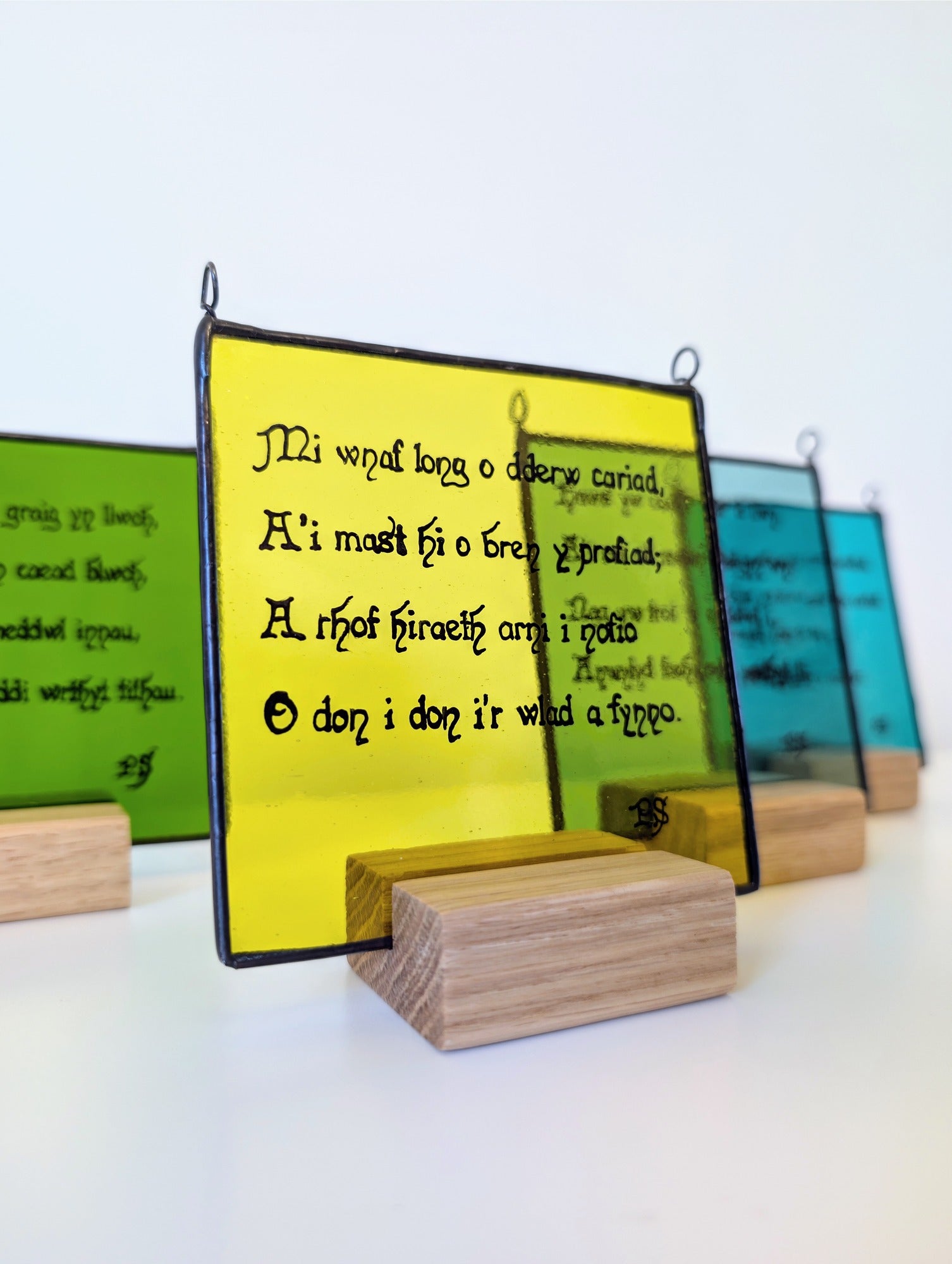 The Hen Benillion series brings these inherited words into contemporary glass. Each verse is hand-painted using traditional medieval glass-painting techniques and kiln-fired onto uniquely coloured and textured glass, allowing old language to breathe again through light, colour, and craft.